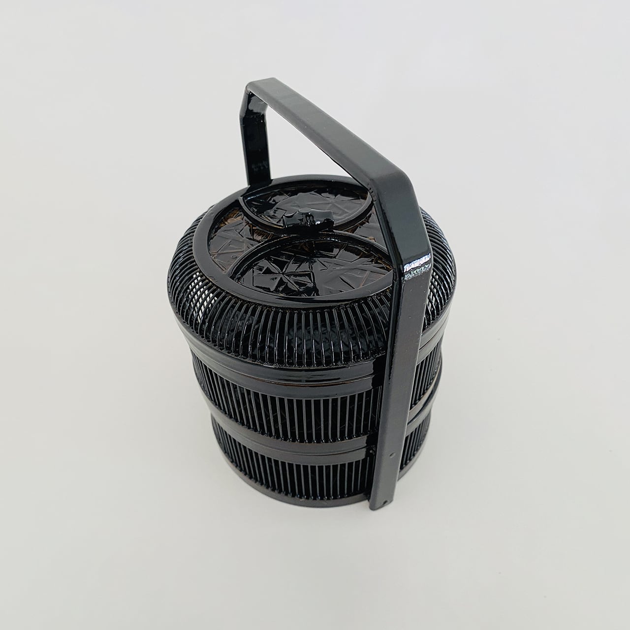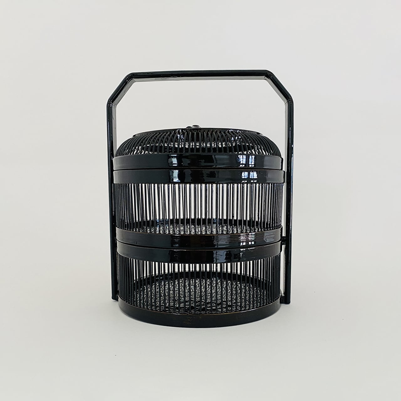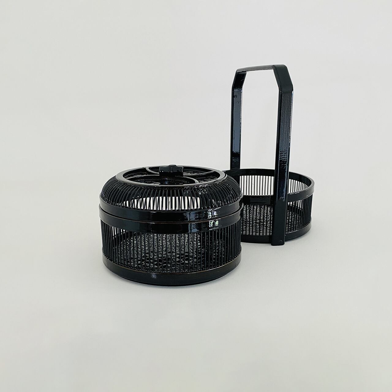 繊細な竹ひご細工が魅力の美しい黒い菓子器です。